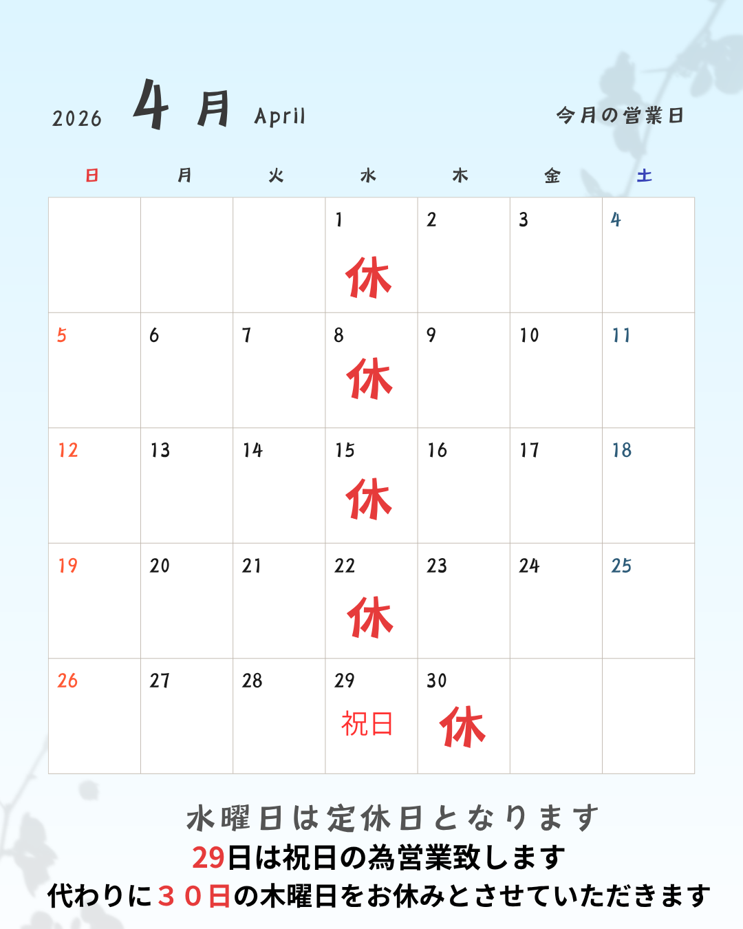 4月29日は祝日の為営業致します
